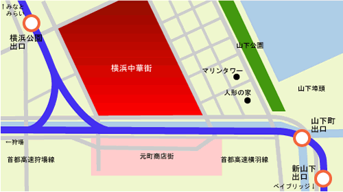 | ● | 首都高速横羽線(みなとみらい方面より) 横浜公園出口または、山下町出口からお降りください。 |